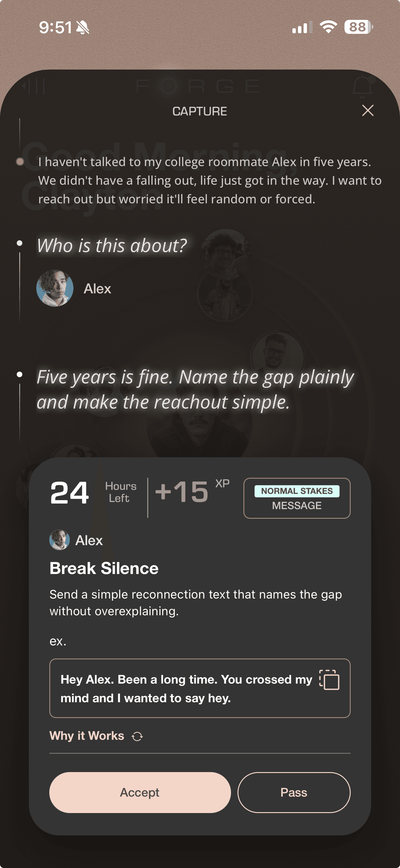 You can’t control how another person responds, but you can control your effort. Forge rewards the attempt. Every completed challenge counts as a rep regardless of the real-world outcome. More reps, more momentum.